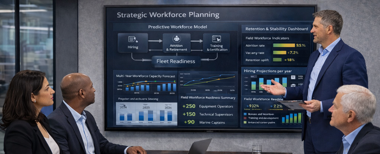 Developed a predictive workforce model linking hiring, attrition, retirement, and competency progression to multi-year capacity forecasts — enabling leadership to anticipate shortfalls and act decisively.